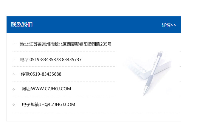 傳真:0519-83435688    郵編:213135    網址:WWW.czjhgj_com.zhenxiongdibj.com    電子郵箱:JH@czjhgj_com.zhenxiongdibj.com